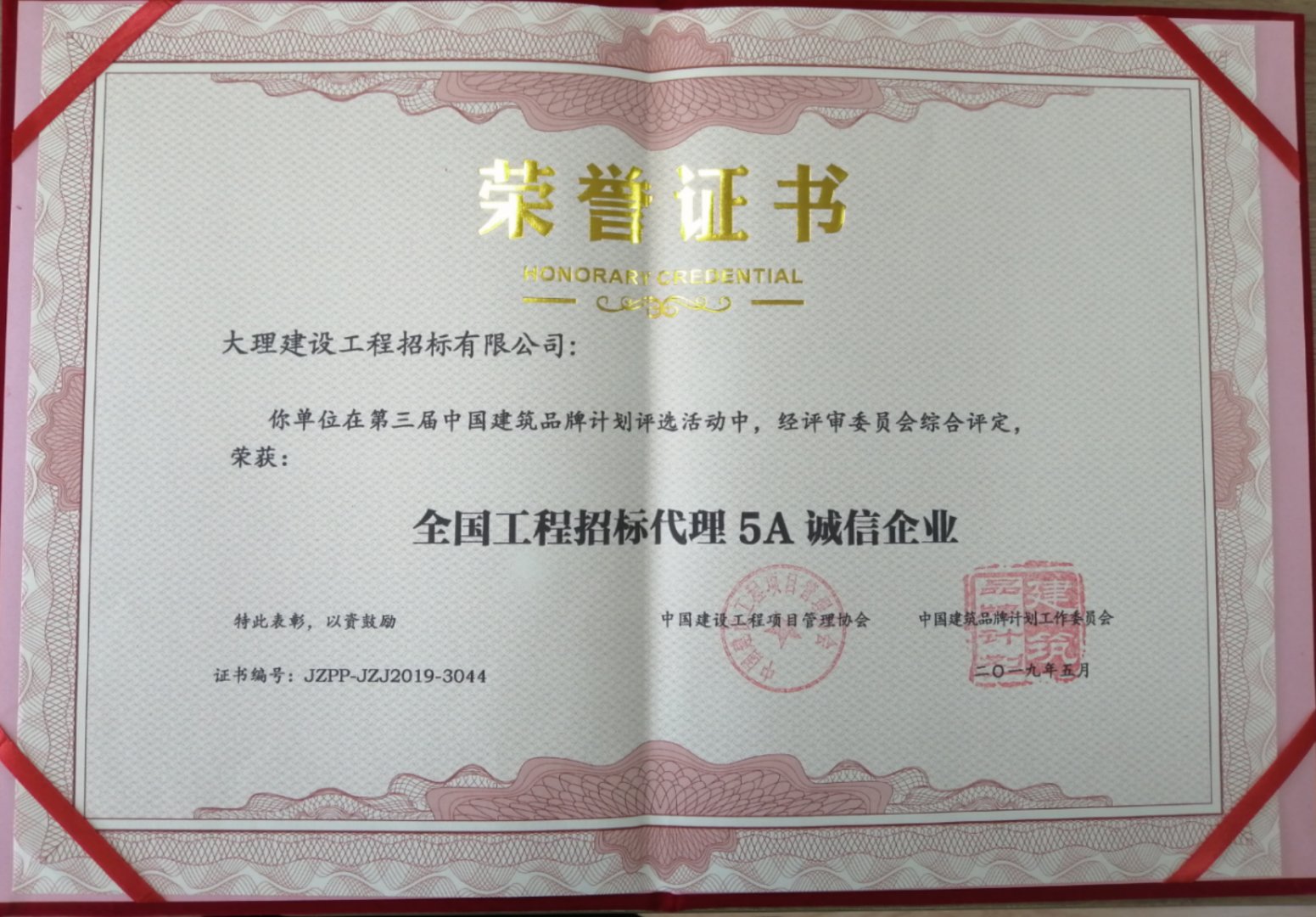 大理建設工程招標有限公司在第三屆中國建筑品牌計劃評選活動中,榮獲:“全國工程招標代理5A誠信企業(yè)